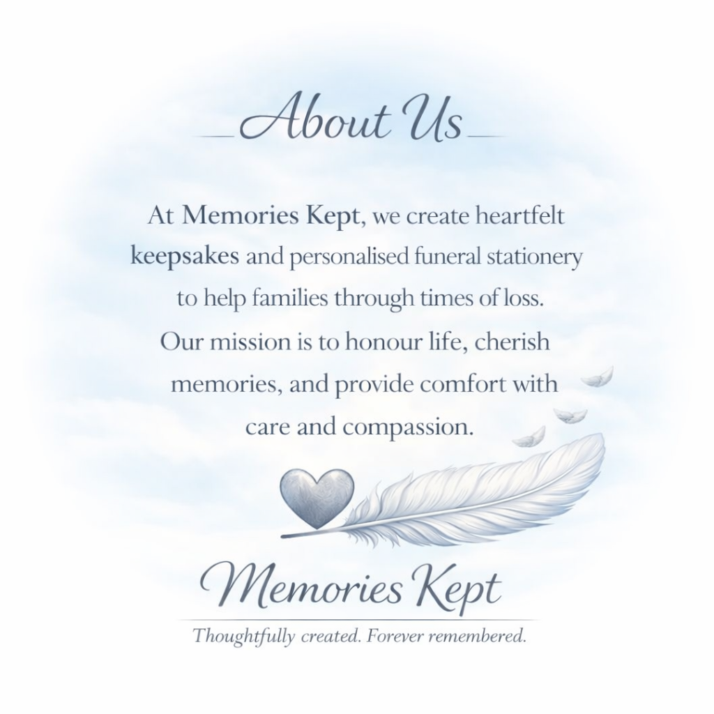 Each piece is thoughtfully designed to reflect individuality — whether that’s through colour, wording, imagery, or tone — because no two lives are the same, and no farewell should feel generic.